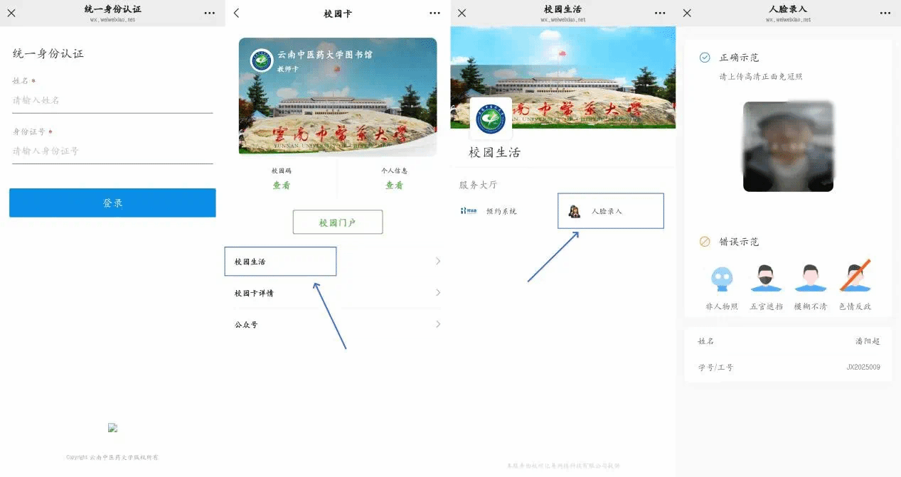 2、领卡成功后,在“卡包”界面找到“云南中医药大学图书馆电子卡”, 进入首页调出校园卡,点击卡片下方“校园生活”进入“人脸录入”图标,再点击虚线框内区域,唤起照相机,按照提示进行本人人脸录入操作,显示有照片,说明录入成功。(如果抓拍到模糊的照片,担心无法识别,可以重新录入)
