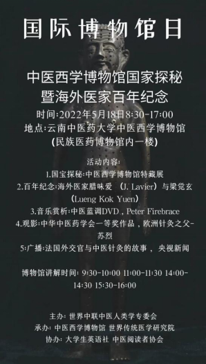 2022年5月18日是“国际博物馆日”,博物馆是保护和传承人类文明的重要殿堂,是链接过去、现在、未来的桥梁,也是文物的保存者和历史的记录者,体现了无穷的魅力和能量。云南中医药大学中医西学博物馆坚持“疫情防控不放松、文化传播不停步”,推出多项内容丰富、形式多样的线下展览活动,此次主题为:“中医西学博物馆国宝探秘 暨海外医家百年纪念”。