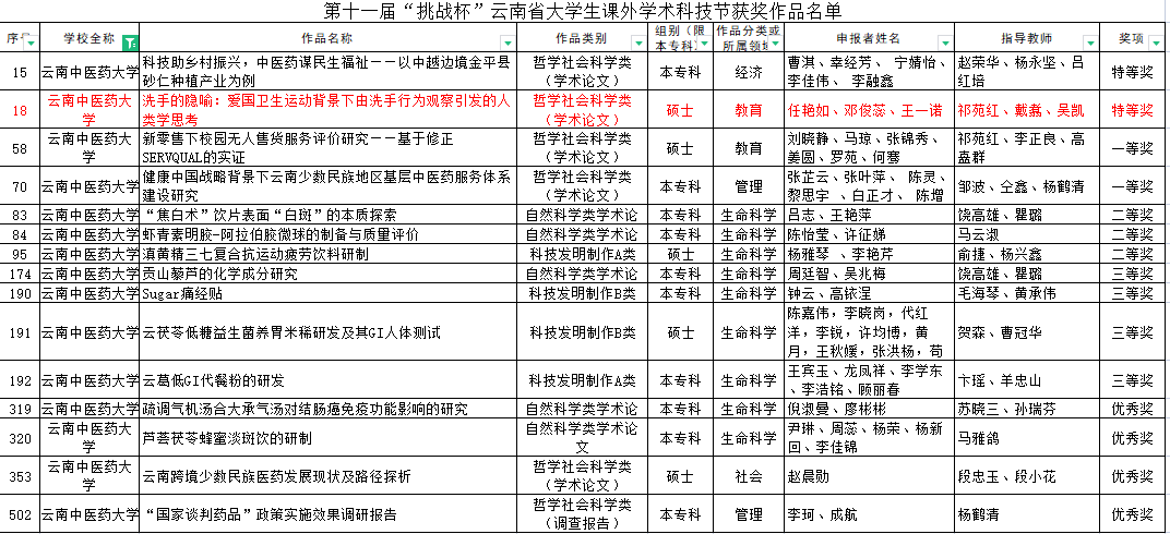 附件:第十一届“挑战杯”云南省大学生课外学术科技节获奖情况公示(http://www.yngqt.org.cn/Info/1/13627/index.html)