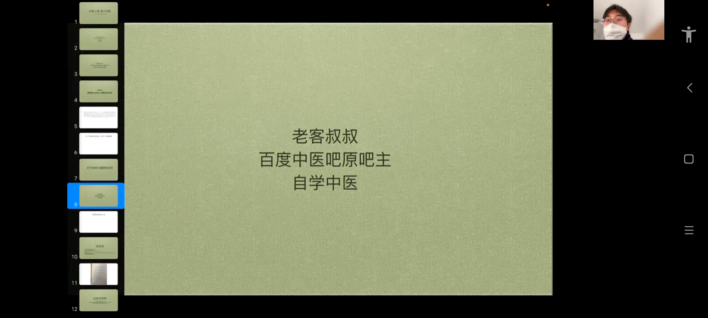 在本次文化沙龙中,张树嵩同学结合自己在康复理疗科的经验,向大家科普了康复科常见病症以及常见的诊疗方法与手段,简述了个人对于各种康复科疾病如颈椎病、落枕、肩周炎、腰椎间盘突出症的理解及反思,同时分享了很多令人印象深刻的临床病历。她把专业知识贴近生活,深入浅出的讲解了康复科常见疾病,分享了自己观察的点点滴滴。毕云帆同学用新颖的方式,运用医学叙事及口述史的方式向我们展示了一些民间中医的医学之路,向我们生动展示了非正统科班出身的中医是如何学习中医,一步步拥有自己的中医理解及感悟的。读万卷书,行万里路,优秀的中医也许成长经历不同,但都离不开为天地立心,为生民立命的中医精神,这也将勉励每一个中医人不忘初心,砥砺前行。
