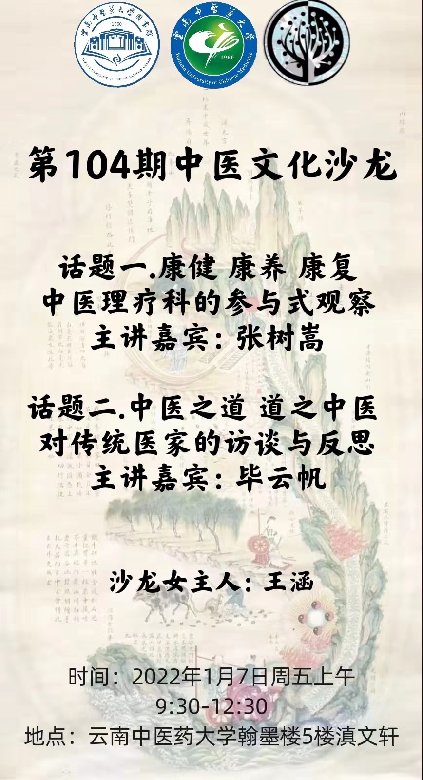 2022年01月07日上午,在云南中医药大学图书馆滇文轩举办了中医人类学第104届文化沙龙,由中医人类学2021级研究生张树嵩、毕云帆同学主讲。张树嵩同学今日主讲的题目为---《康健、康养、康复--中医理疗的参与式观察》,张同学是云南中医药大学中医人类学2021级研究生,入学前曾在济宁友谊医院儿童妇女保健科工作过2年,在济宁鲁抗医院康复科工作过3年。毕云帆同学今日主讲的题目为---《中医之道、道之中医--对传统医家的访谈与反思》,毕同学现如今是云南中医药大学中医人类学硕士研究生在读,本科就读于广西中医药大学传统中医班,对中国传统文化以及医学人类学有较为浓厚的兴趣。本次文化沙龙由中医西学研究所吴凯副教授指导,由研究生王涵主持,活动通过腾讯会议进行了同步直播。
